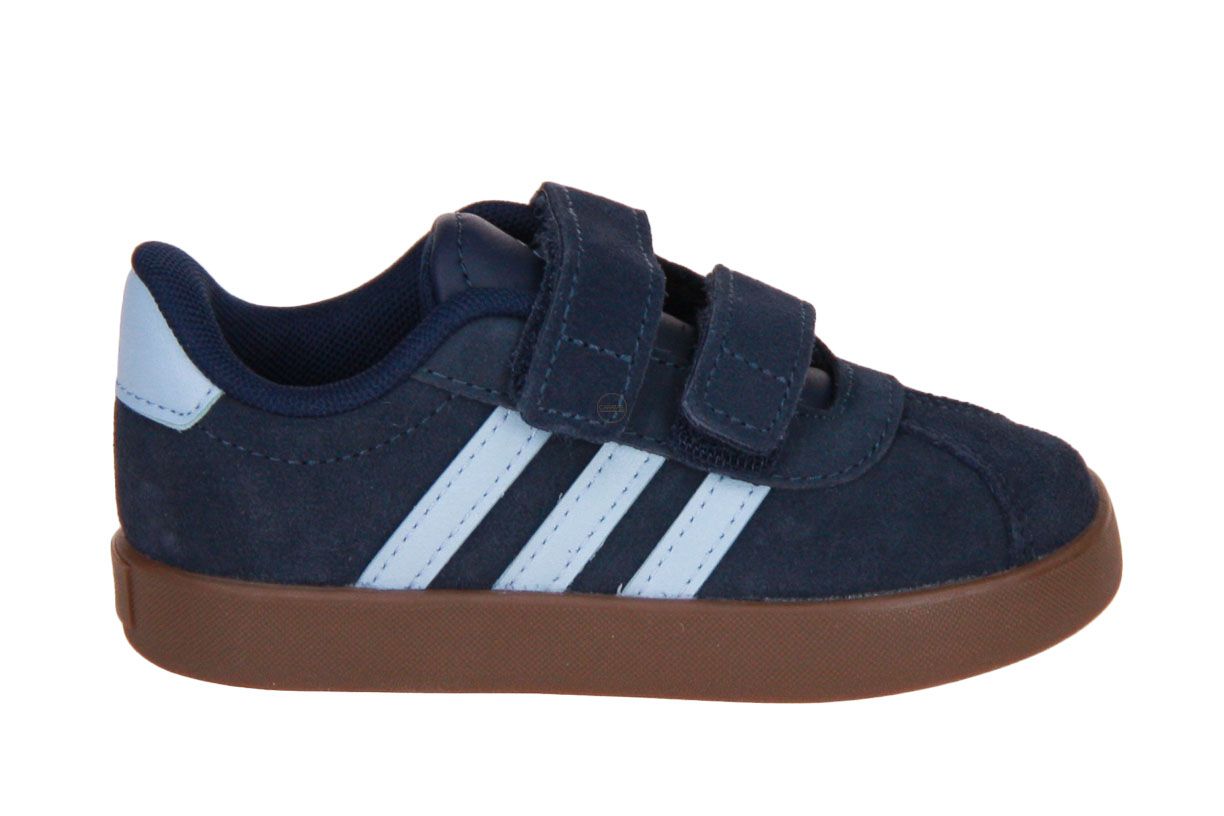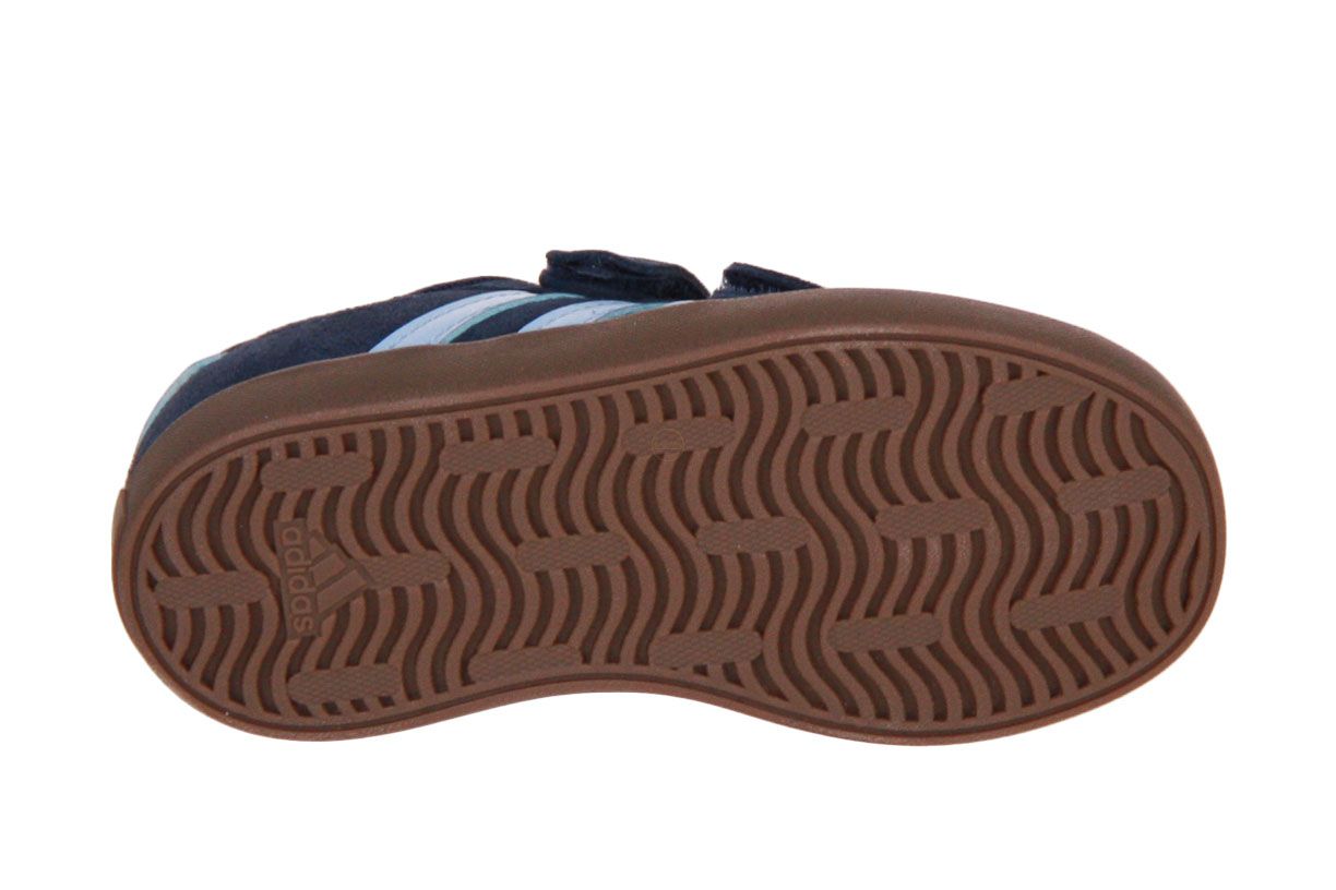 Deze blauw suède kinderschoen is van het merk Adidas.