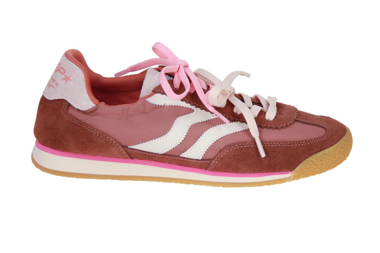 Deze bruin suède damesschoen met roze accenten is van het merk MRP. De binnenzool is uitneembaar, ideaal voor steunzolen.