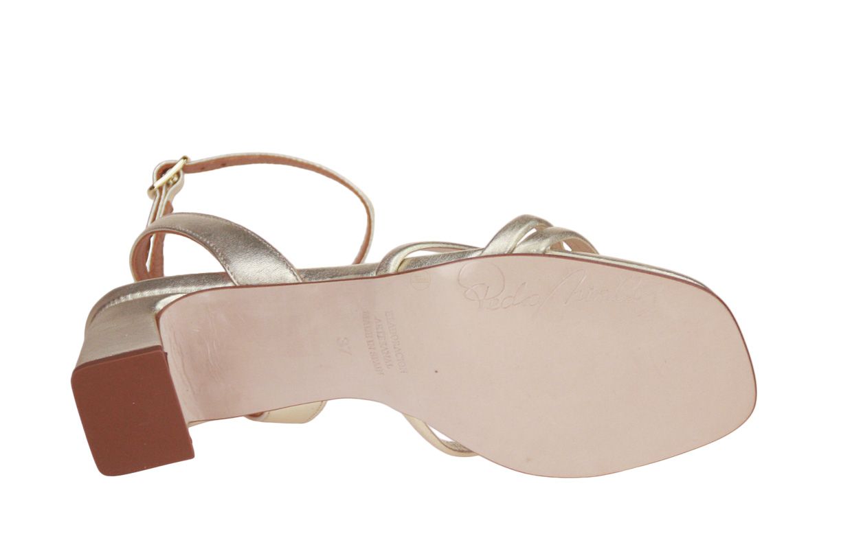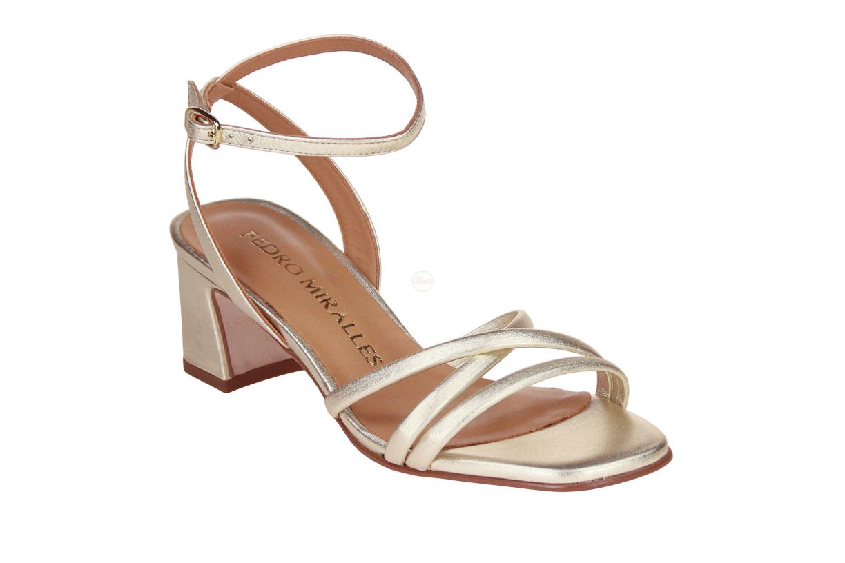Deze goud lederen damessandaal is van het merk Pedro Miralles.