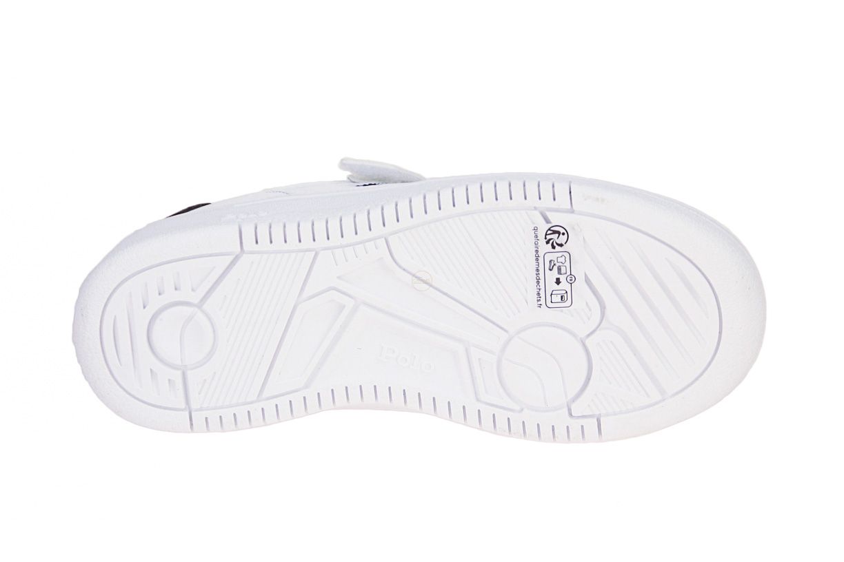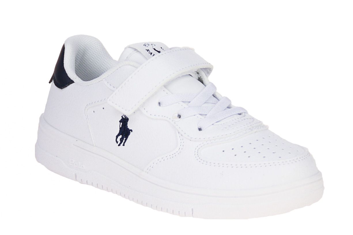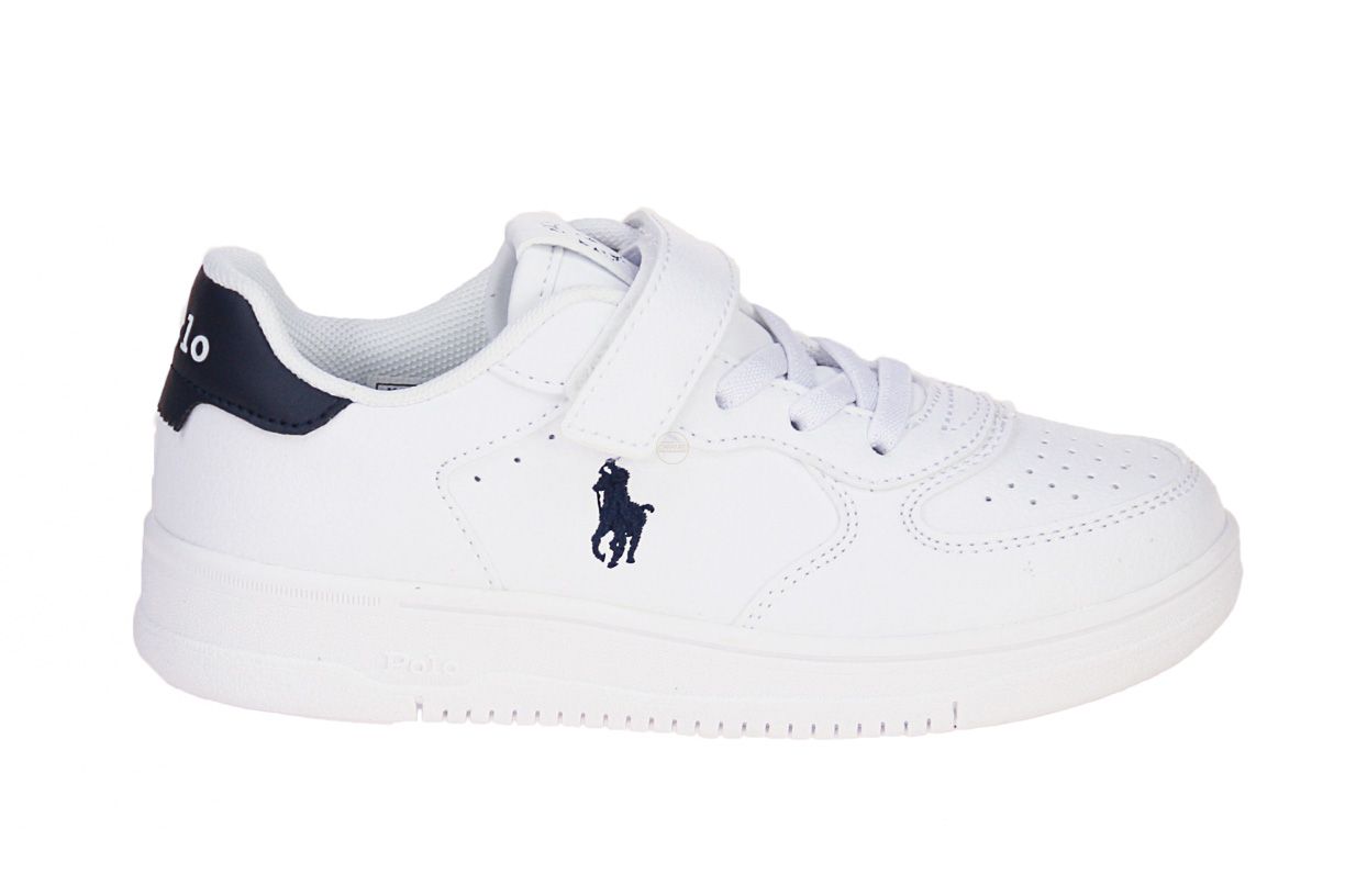 Deze wit lederen kinderschoen is van het merk Ralph Lauren Polo.