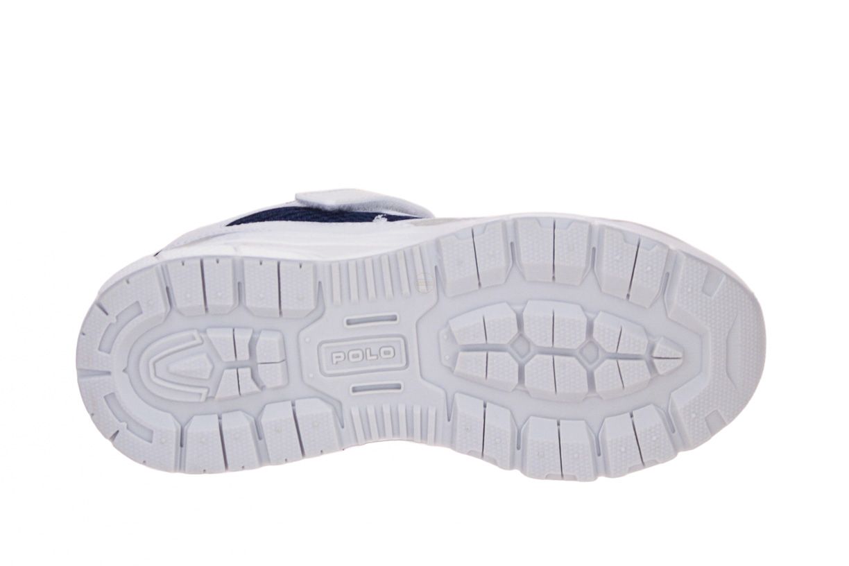 Deze wit lederen kinderschoen met blauwe accenten is van het merk Ralph Lauren Polo.