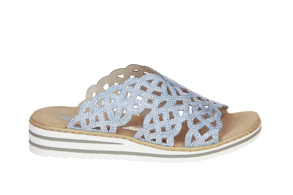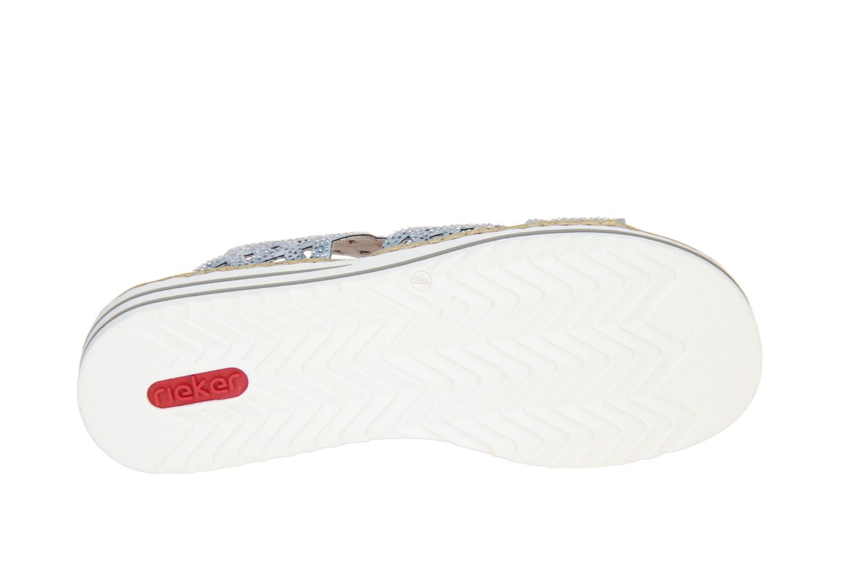 Deze blauw textielen damesslipper is van het merk Rieker.
