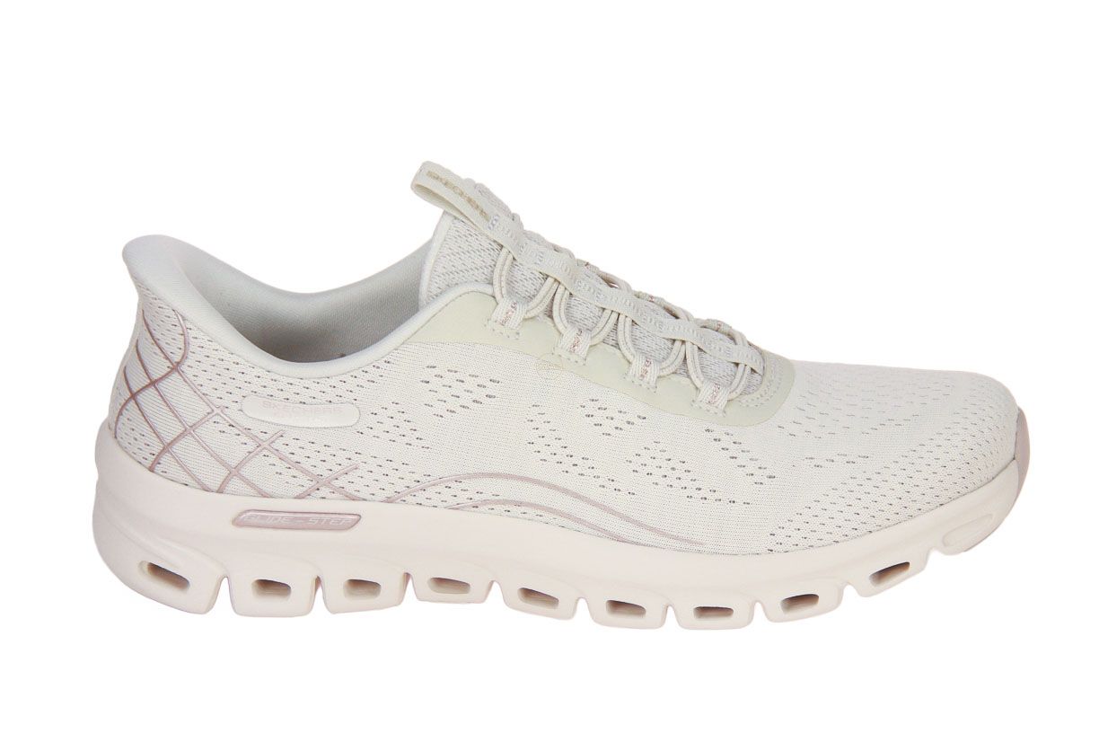 Deze offwhite textielen damesschoen is van het merk Skechers.