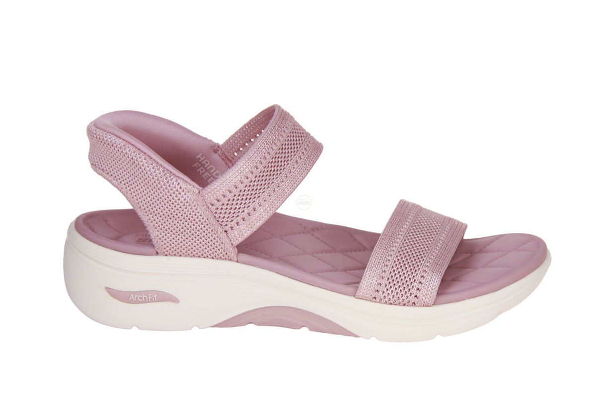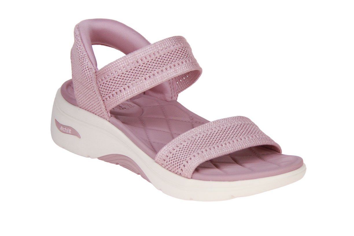 Deze roze textielen damessandaal is van het merk Skechers.