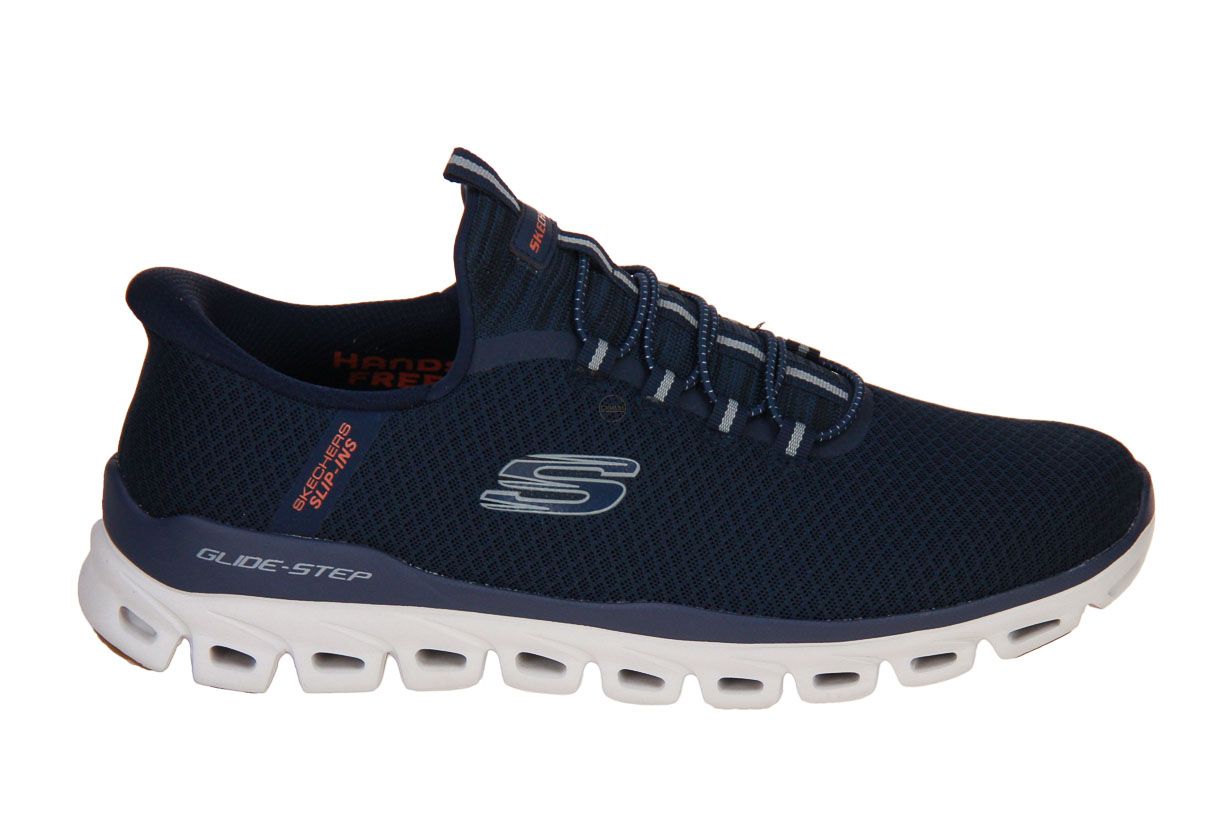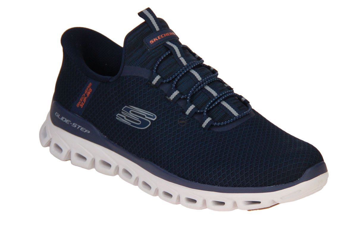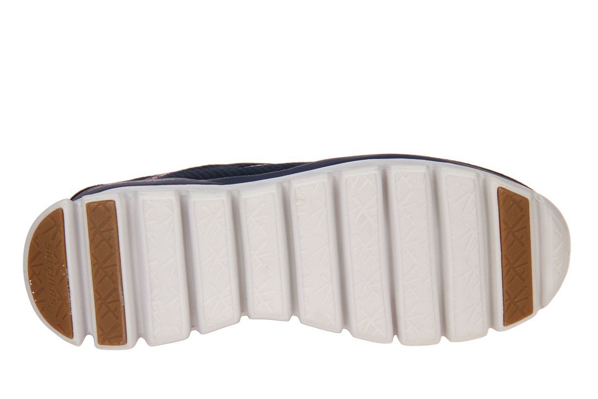 Deze blauw textielen herenschoen is van het merk Skechers.