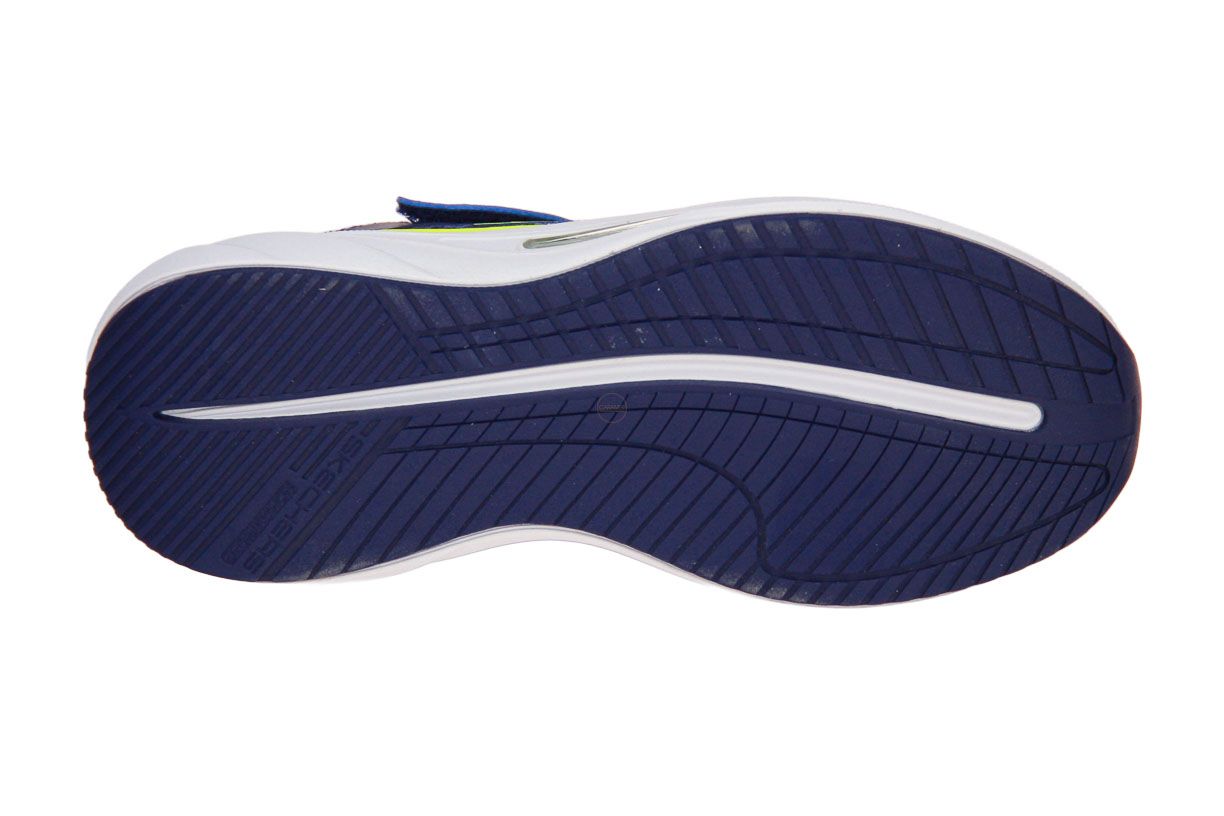 Deze blauw textielen jongensschoen is van het merk Skechers.