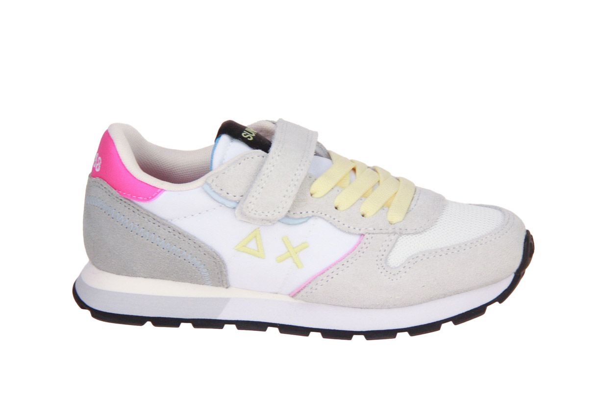 Deze wit textielen meisjesschoen is van het merk SUN68. De binnenzool is uitneembaar, ideaal voor steunzolen.